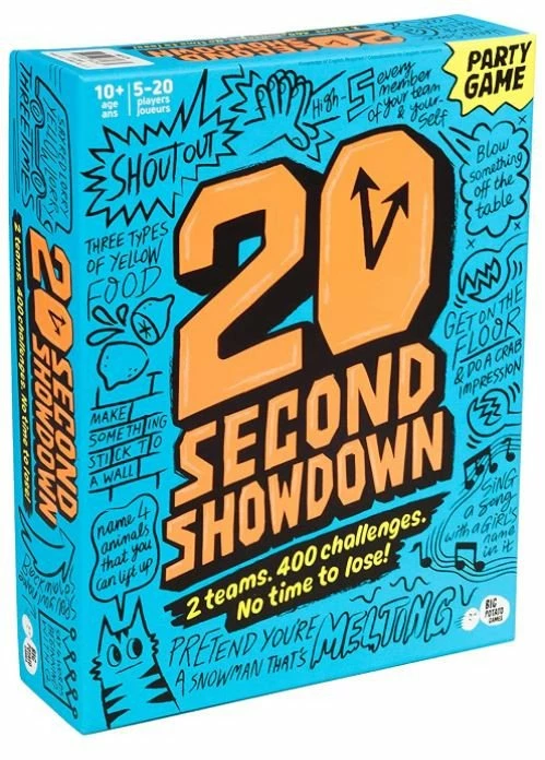Choose a player to referee the contest in 20 Second Showdown. Everyone else splits into two teams and sits opposite each other, face-off style. At the beginning of each round, the referee resets the timer with an even amount of “sand” in each half. The referee’s job is to read out the challenges and flip the timer, which has twenty seconds of sand in each half. To win, you need to force the other team to run out of “sand” by completing your challenges as quickly as possible. The first team to run out of “sand” loses the round, and the first team to win three rounds is crowned “20-Second Champions”.