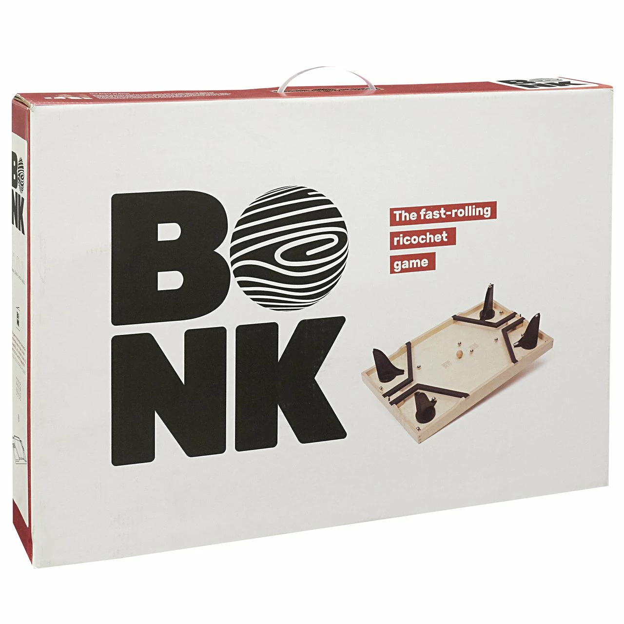 BONK is a fast-rolling ricochet game that’s ideally played with four players. Your goal? Roll steel balls down your slide in order to knock the wooden ball in the central arena into your opponents’ goal. Players compete in teams of two, with each team trying to protect one goal between them. (If you play individually, you will likely need to alternate between slides as it’s difficult to roll balls down both slides at once.)