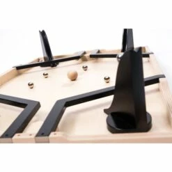 If you run out of steel balls, then you’re at the opponents’ mercy until they shoot, which will likely land a steel ball on your side of the board. If you knock the wooden ball into the opponents’ goal, you score a point, then the next round begins with the steel balls remaining on the half of the board where they’re currently located. The first team to score five points wins!