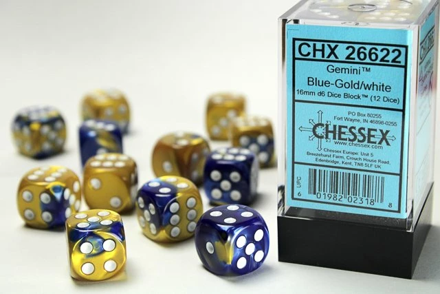 CHESSEX DICE – 16MM D6 (12) GEMINI-BLUE-GOLD/WHITE