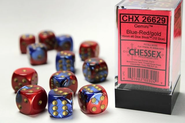 CHESSEX DICE – 16MM D6 (12) GEMINI BLUE-RED/GOLD