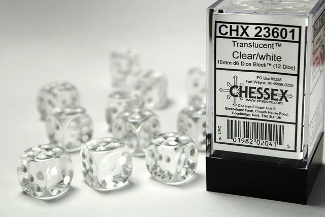 CHESSEX DICE – 16MM D6 (12) TRANSLUCENT CLEAR/WHITE