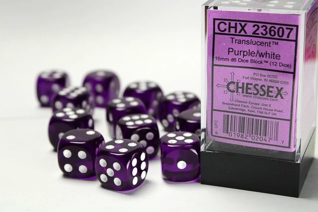 CHESSEX DICE – 16MM D6 (12) TRANSLUCENT PURPLE/WHITE