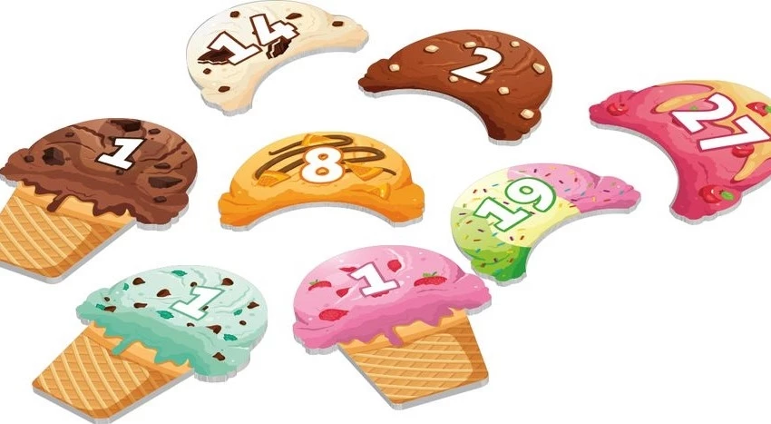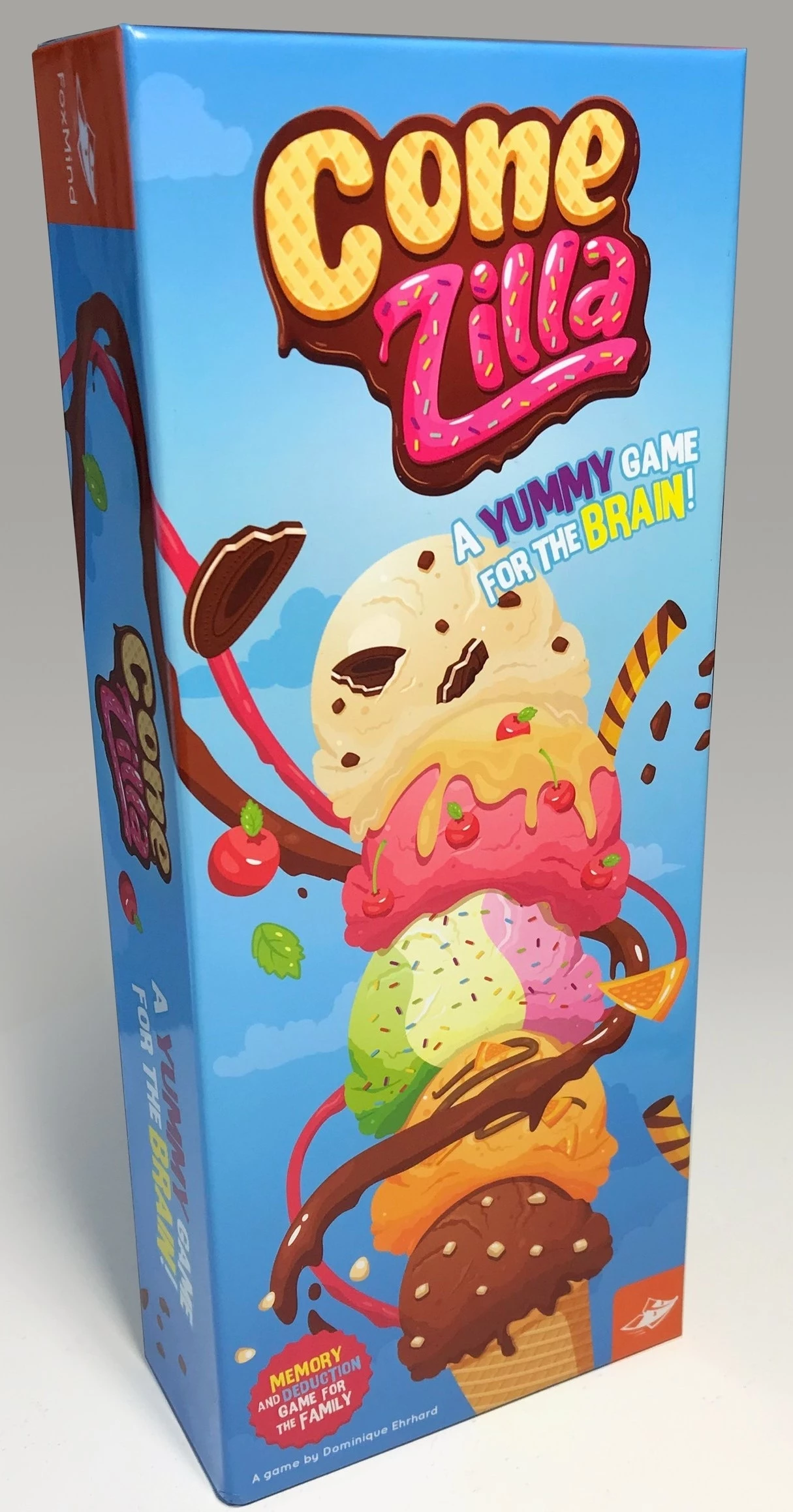 The object of the game is to be the first to build the most spectacular 10-scoop ice cream ConeZILLA. Each player starts with a cone and one scoop of ice cream. All other scoops numbered between 2 to 49 are placed face down on the table. Players take turns flipping over a scoop and decide whether to add it on top of their growing cone or flip it back into place. Players can add a scoop to a cone only if its value is higher than their current top scoop.