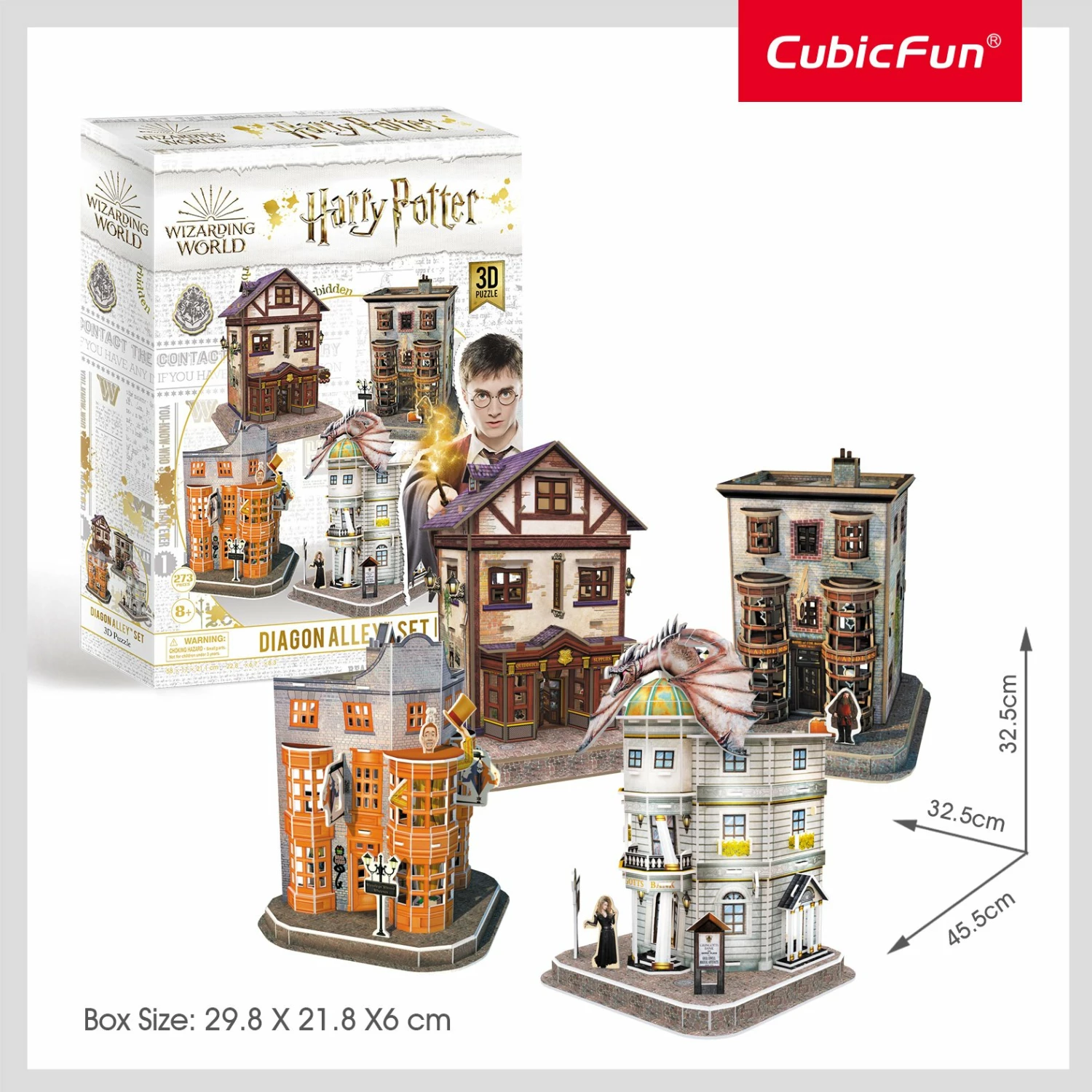 - Size: 17x58x21,1cm. Build Harry Potter’s Diagon Alley: the Gringotts bank, the Quidditch quality goods shop, the Olivanders wand shop and the Zonko joke shop. 273 pieces. No tools or glue needed. Assembly time: 240 minutes. Age: +8 years.