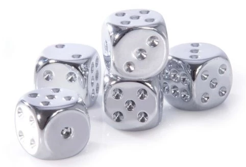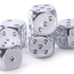 Set of 5 metallic silver Dice in a tin with a booklet containing 8 fun dice games, or perfect as a set of cool chromed dice for using with existing games.