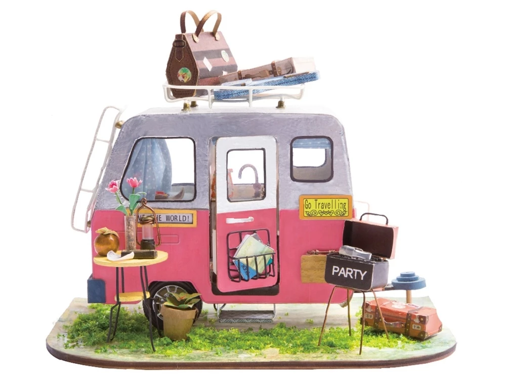 The pacakage contains Wood, Fabric, Paper, glue, paint, tweezers, brush. The pieces are separated into labeled bags and are letter/number coded. Easy assemble with instructions. The tiny accessories showed in the picture can be painted, cut stuck to build with your hands.
