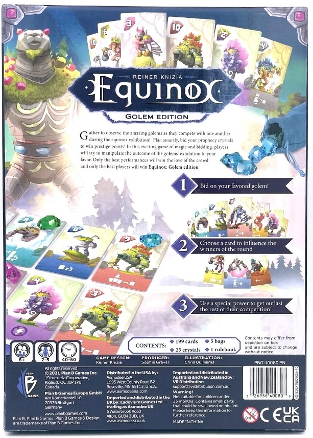 Fans of Dr. Reiner Knizia might recognize Equinox as a revised edition of the previously released game Colossus Arena, but with two new creatures. Of the fourteen unique creatures, only eight are played in a game, which means more than three thousand different combinations are possible. To celebrate the equinox occurring twice a year, players can select from two distinct box covers, but note that the contents in each box are identical.