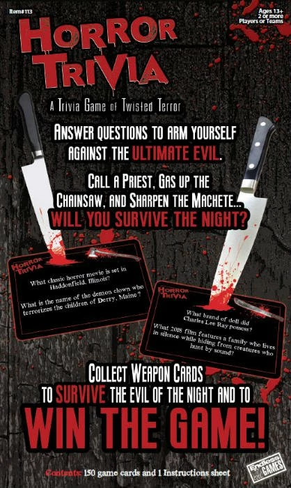 A trivia game of twisted terror! For Halloween or ANY TIME you want to challenge your friends and yourself on fun frightening facts and figures! Answer questions to arm yourself against the ultimate evil. Call a priest, gas up the chainsaw, and sharpen the machete…will you survive the night?