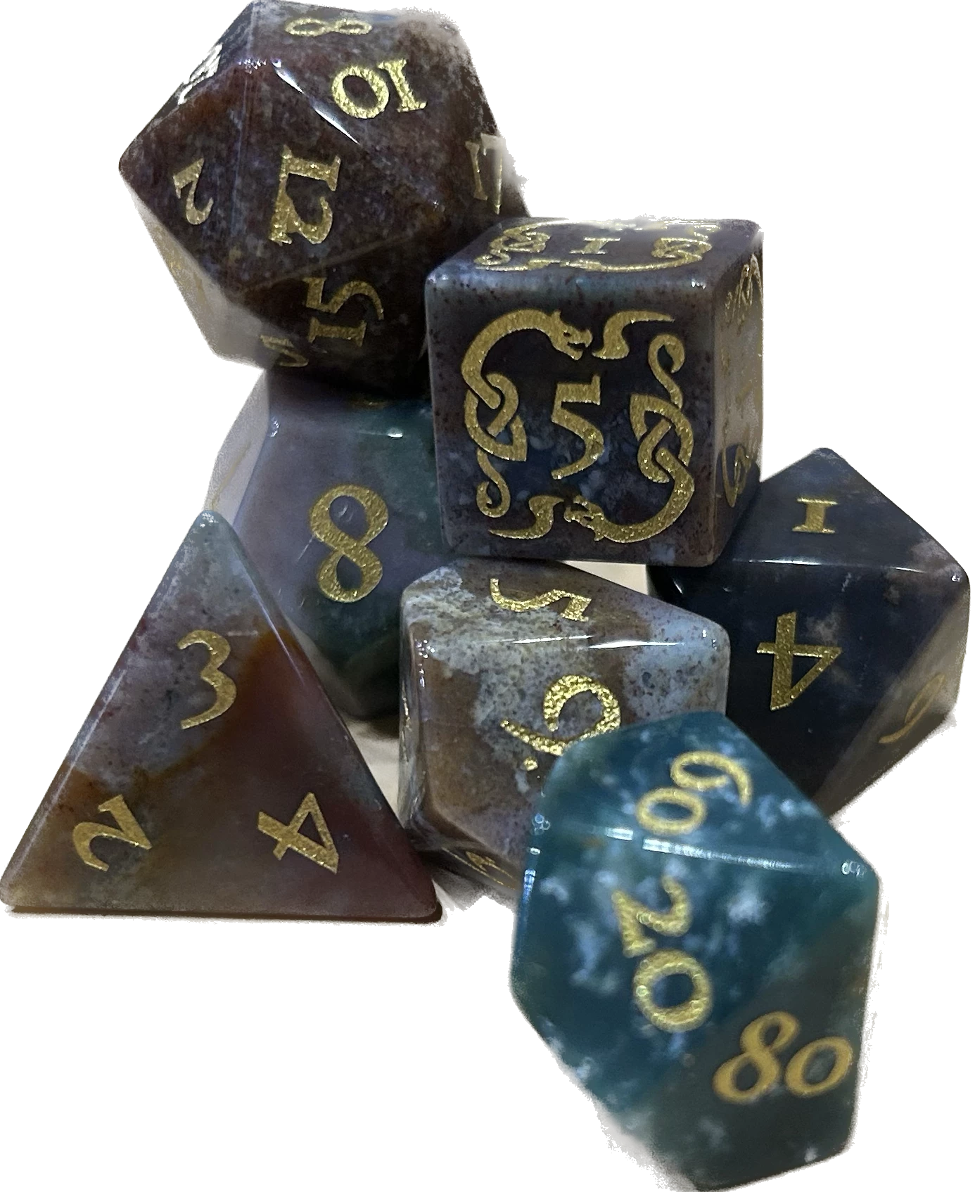 Natural Stone Disclaimer: Please note when ordering a set of Semi-Precious Dice, they are created from natural materials, and there will be differences between every die. Level Up Dice Semi-Precious Dice are hand-crafted, so there may be minor variations such as slight size differences, asymmetrical faces, or off-centre numbering. As such, each die is unique and may not be perfectly symmetrical; their roll is as balanced as one would expect from acrylic dice.