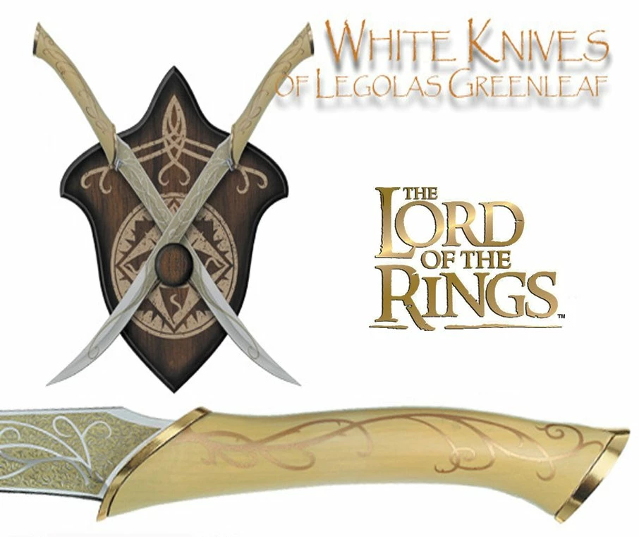 Features 2 full length tang knives with deep etched Elven vine design blades, gold tone colour and wood handles. Complete with wooden display plaque adorned with the badge of the Greenleaf family of Legolas. Each knife measures 57cm in length.