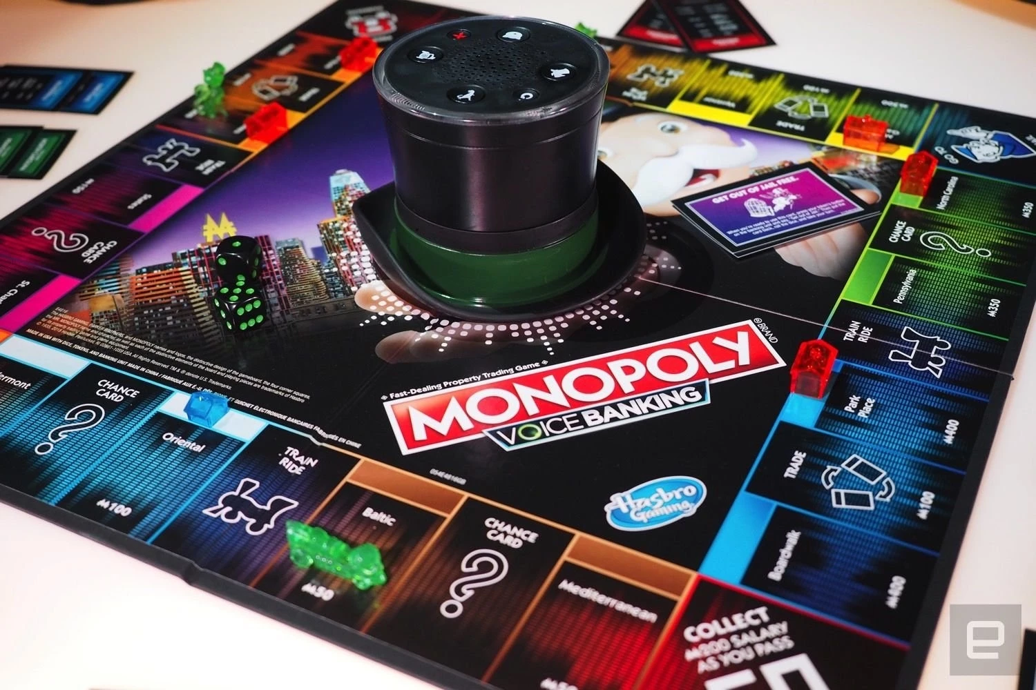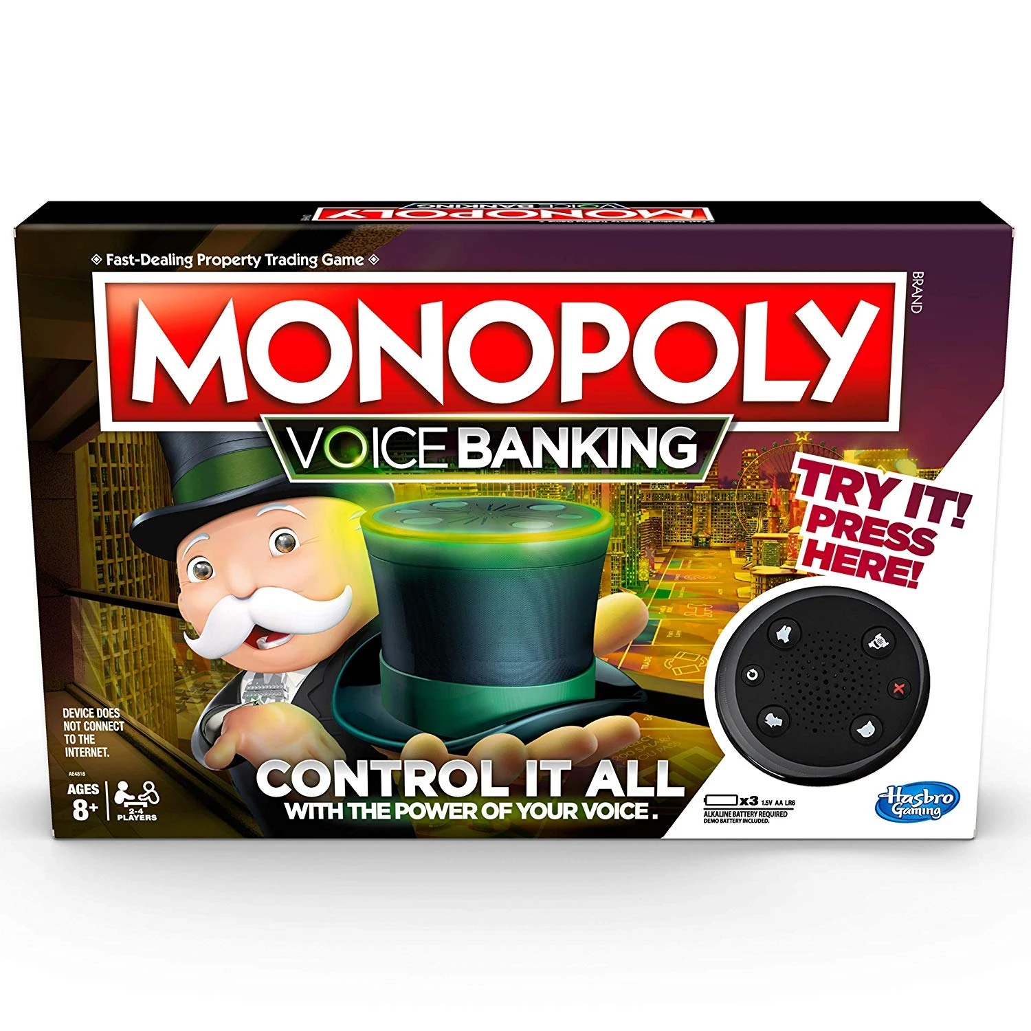 In this electronic MONOPOLY Voice Banking game, Mr. MONOPOLY is the Banker and manages players’ money via his top hat. Press the button, and say a command like, “Pay Rent on Marvin Gardens”; Mr. MONOPOLY will respond and move the payment to an opponent’s account