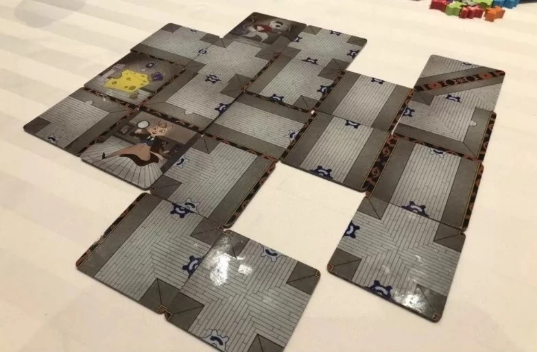 In Mouse Cheese Cat Cucumber, four characters each have their own hidden agenda: The Mouse weants the Cheese, the Cat wants the Mouse, the Cheese wants everyone to get along (they’re neutral, they’re Swiss), and the Cucumber wants everyone trapped together. On your turn, add another room to the growing clockwork maze with the goal of furthering your character’s secret objective.