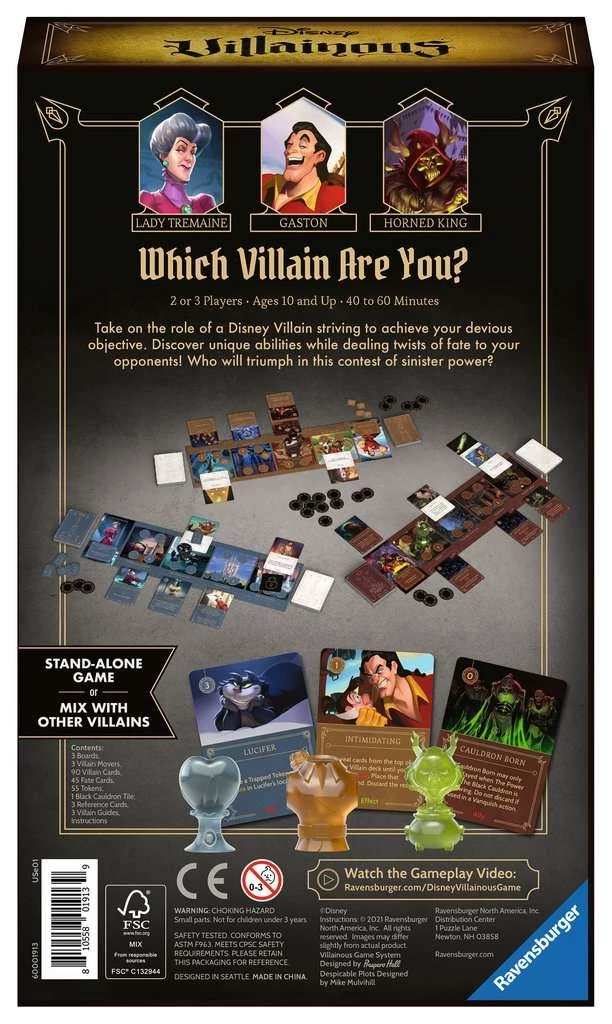 In , each player takes control of one of three Disney characters, each one a villain in a different Disney movie, specifically Lady Tremaine (Cinderella), the Horned King (The Black Cauldron), and Gaston (Beauty and the Beast). Each player has their own villain deck, fate deck, player board, and 3D character.